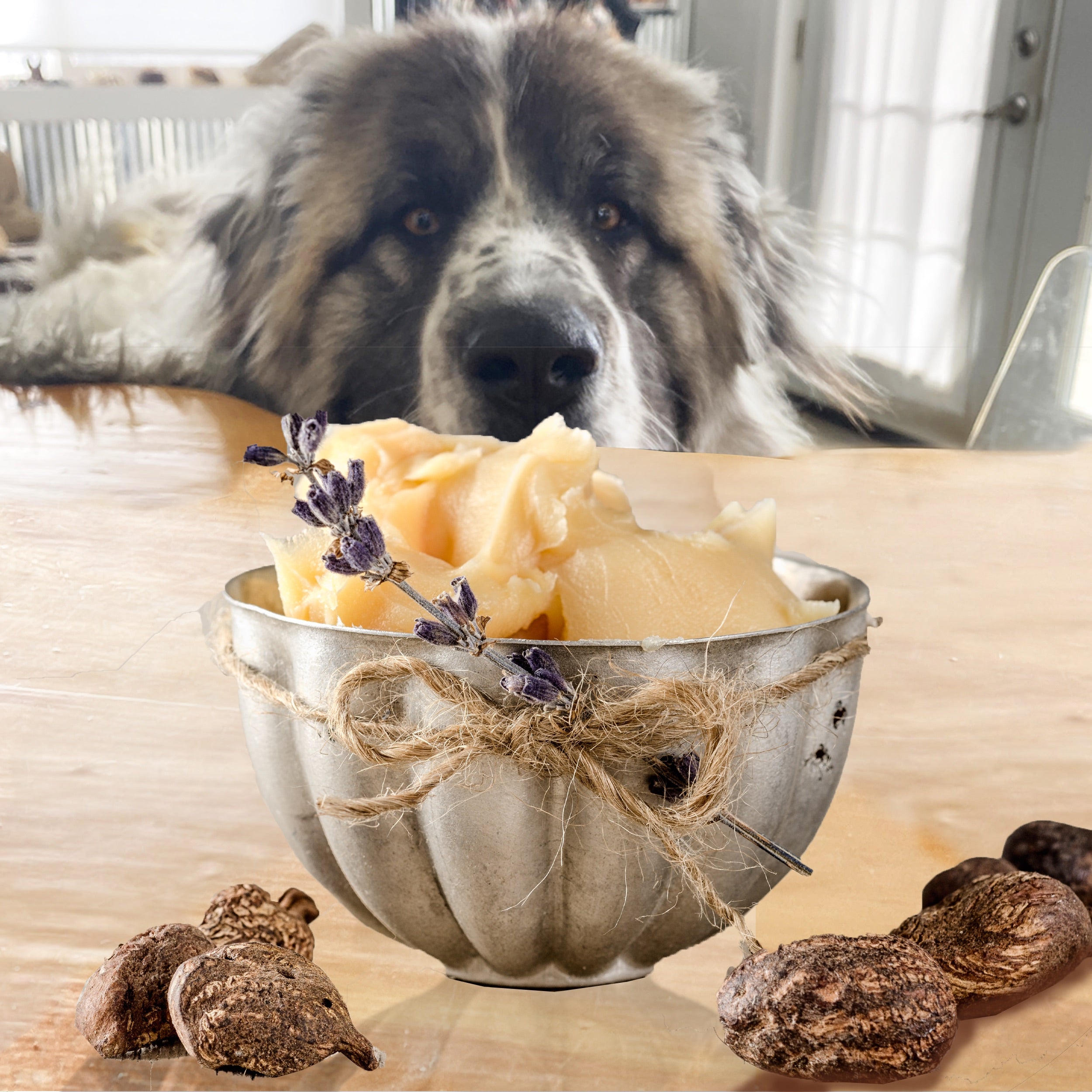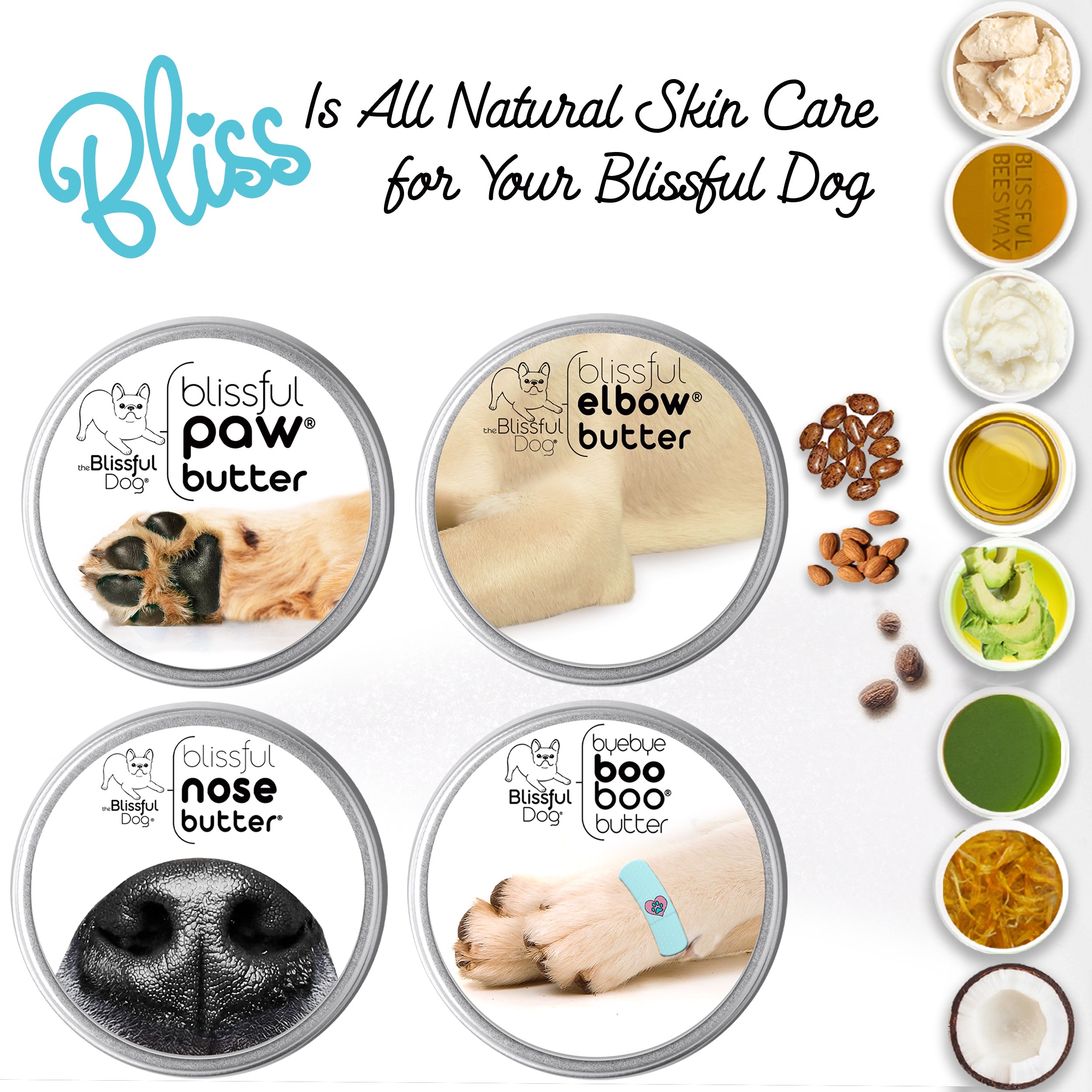 Our Blissful Butters are a rich, dense, very thick moisturizer that drenches your dog's dry nose, paws and elbows in all-natural butters, fats, and oils.